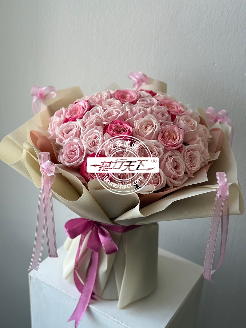 描述: 粉色玫瑰组成、精美包装。